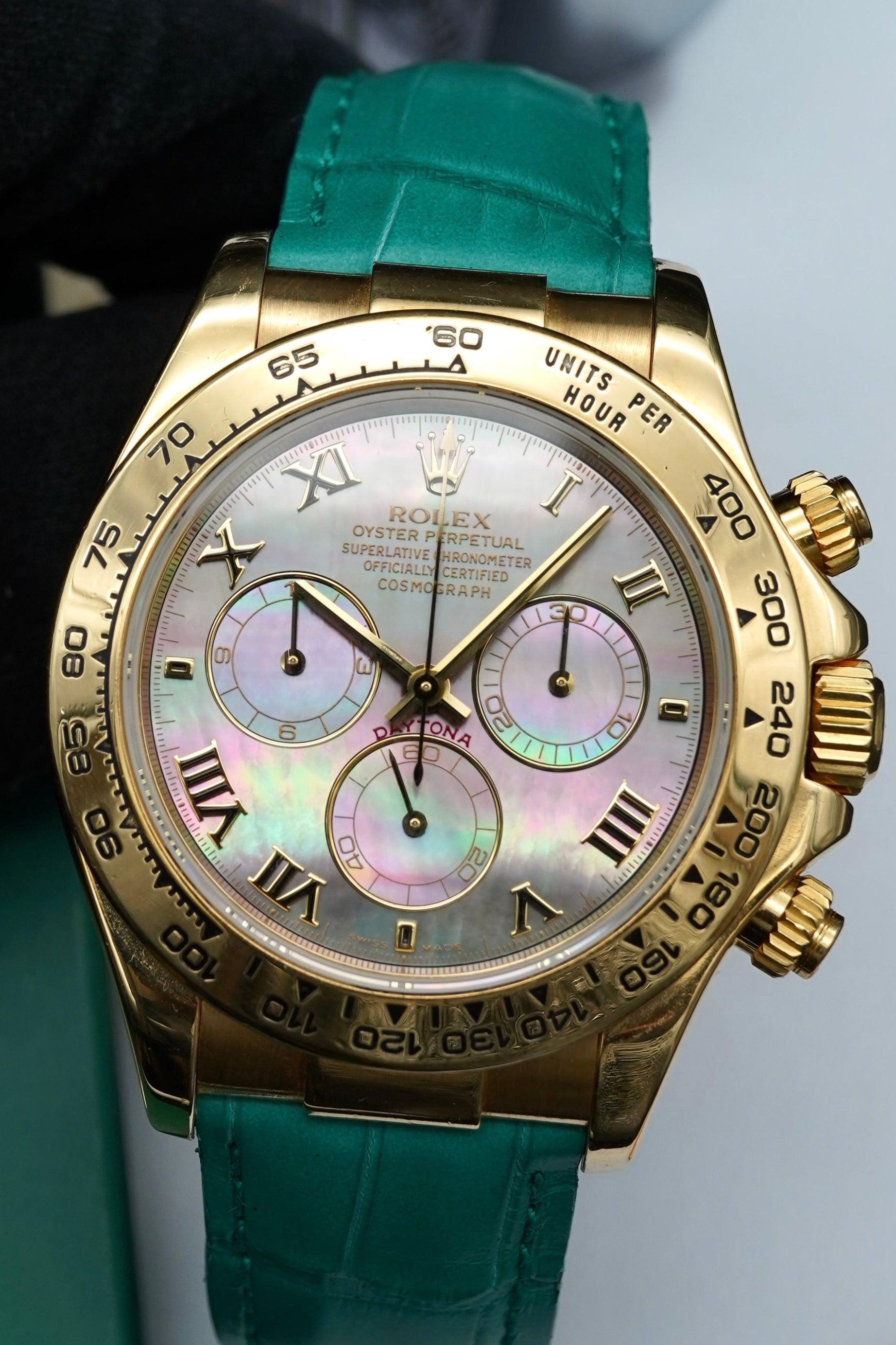 The 40 mm 18kt yellow gold case, paired with an 18kt gold bezel and caseback, gives the watch a strong yet refined presence. The true highlight is the stunning Tahitian mother-of-pearl dial, in perfect condition, distinguished by unique and iridescent natural reflections that make each piece truly one of a kind.