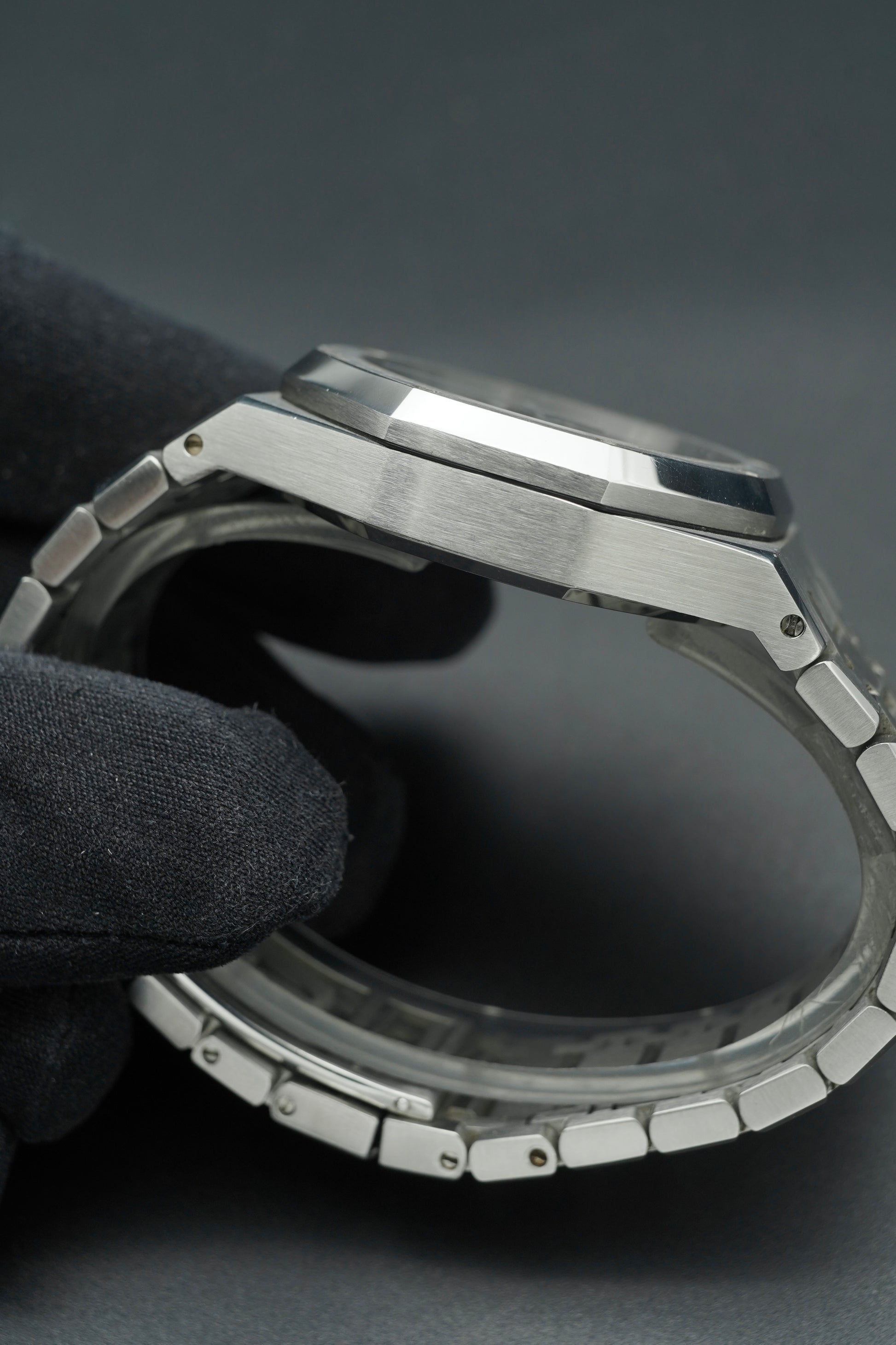Featuring the hallmark octagonal bezel in stainless steel and the integrated bracelet, the design delivers an unmistakable Royal Oak silhouette. Beneath the scratch-resistant sapphire crystal ticks the self-winding chronograph calibre 2385 — a technical movement engineered for precision and reliability.