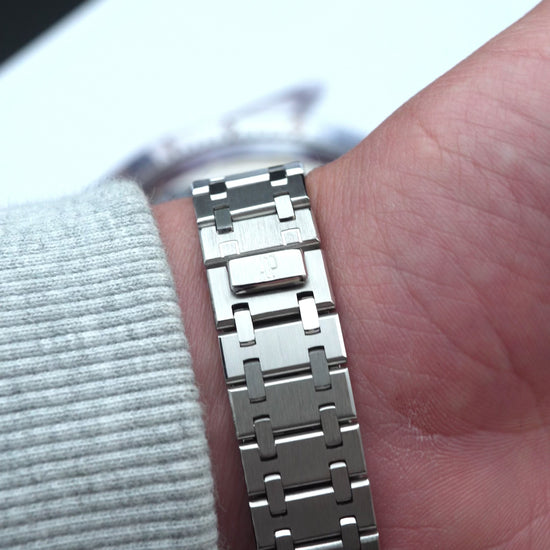 Inside beats a highly reliable automatic mechanical movement, making this Royal Oak not only iconic in terms of aesthetics but also extremely functional. The integrated stainless steel bracelet, with a hidden deployant clasp, ensures comfort and stylistic continuity, completing a watch with a strong sporty-elegant character.