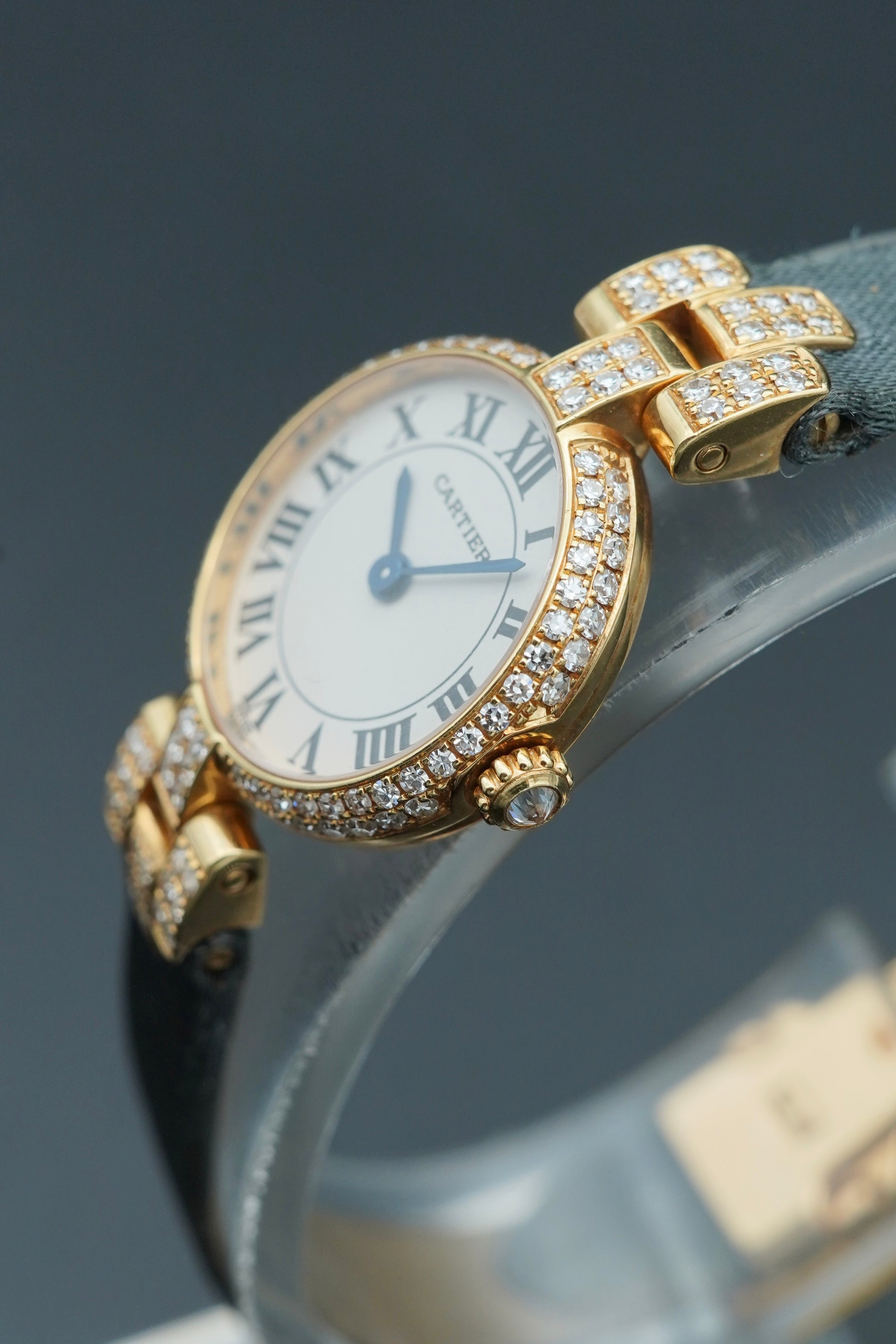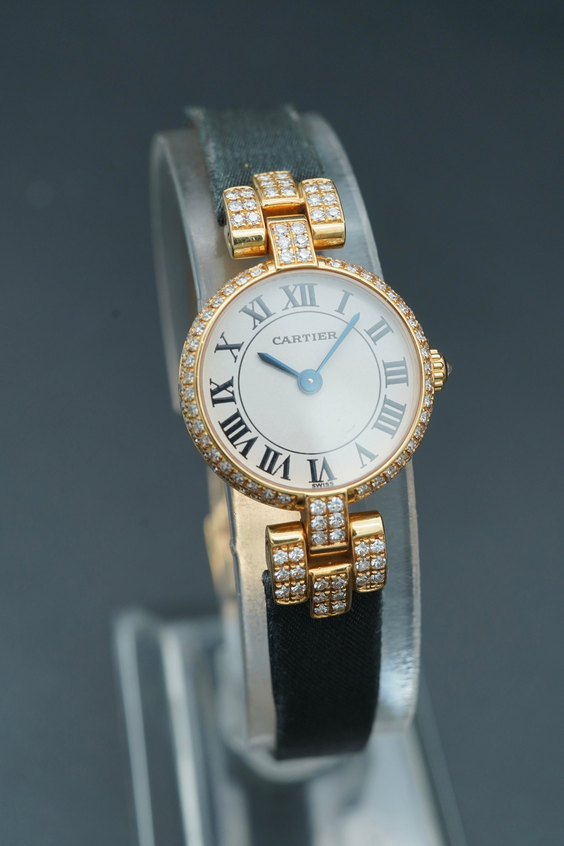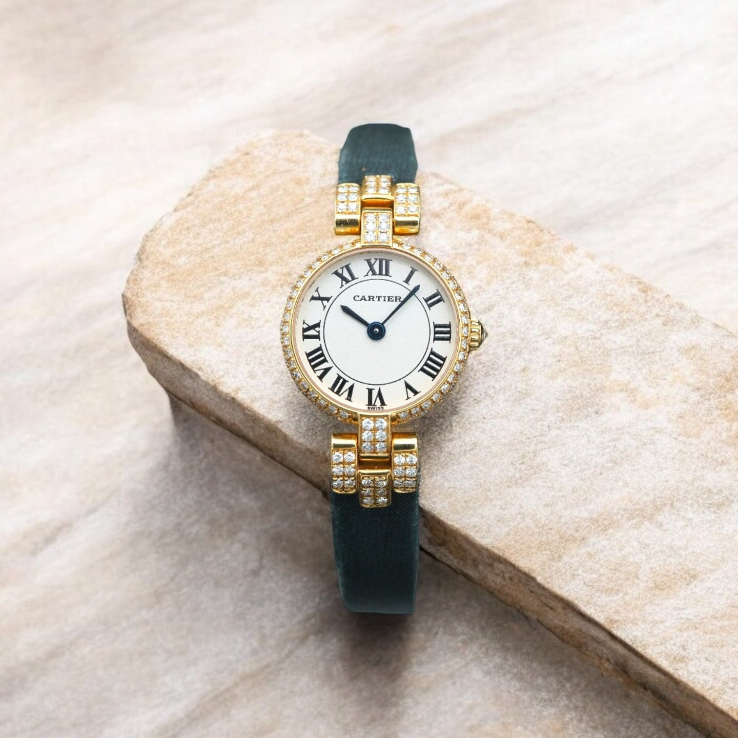 The watch is powered by a quartz movement, ensuring practicality and precision, ideal for everyday wear without compromising elegance. Completing the ensemble is the original Cartier satin strap with a deployant clasp, perfectly in line with the model’s sophisticated and feminine style.