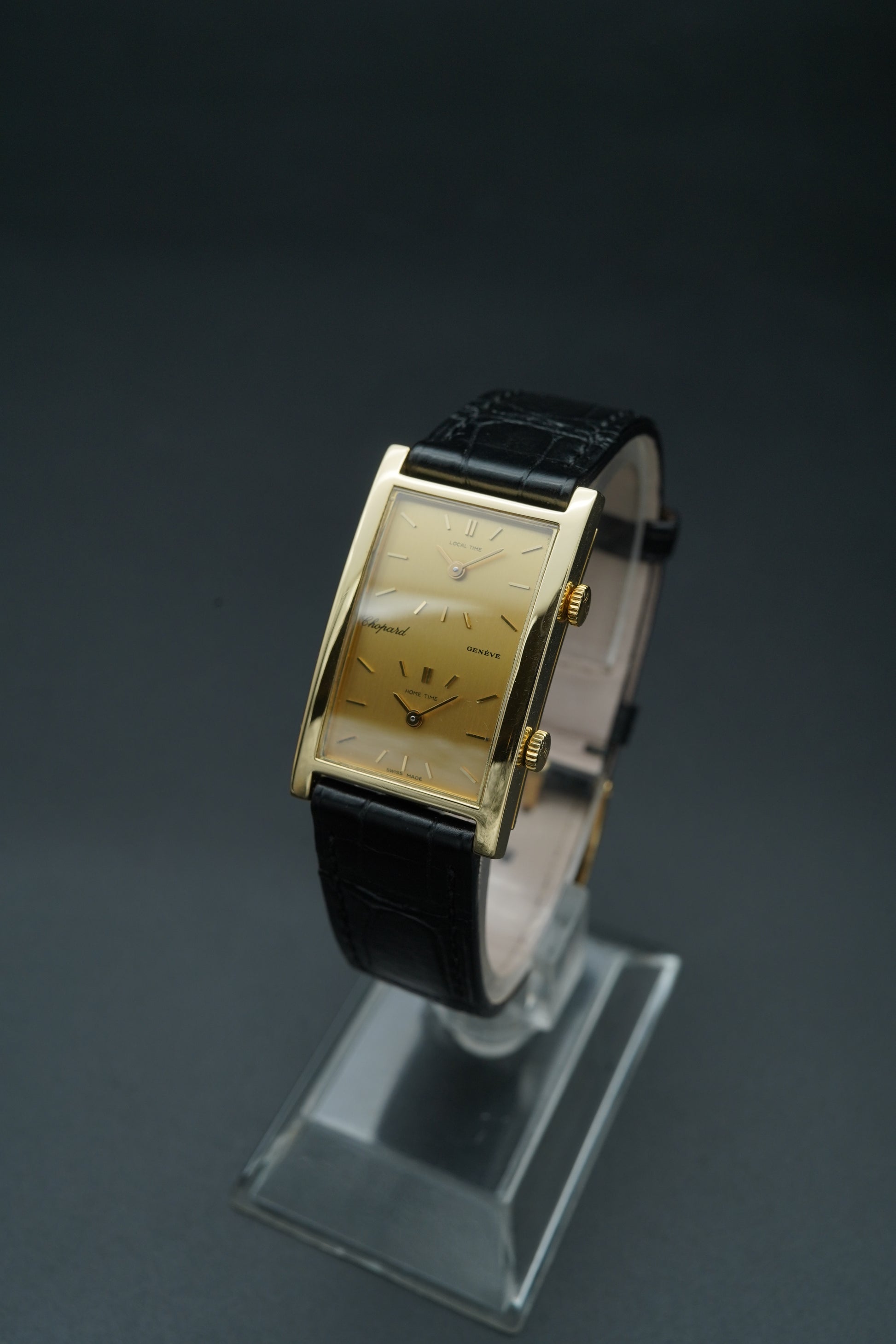 The original leather strap, in like-new condition, is paired with an 18kt gold pin buckle, ensuring comfort and elegance on the wrist, making this Chopard a unique and refined collector’s timepiece.