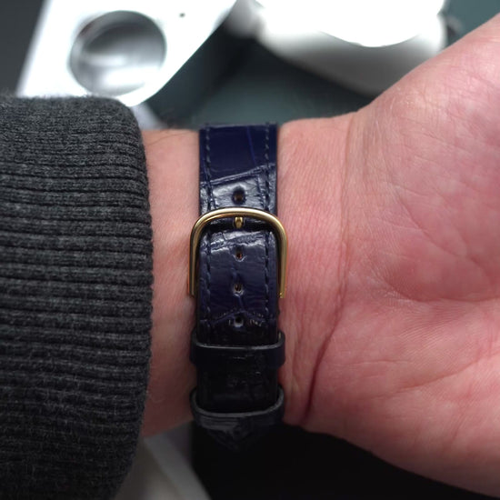 Powered by a reliable manual-winding movement, this timepiece delivers classic mechanical performance in a refined package. The elegant blue crocodile leather strap complements the dial and gold case beautifully, creating a cohesive and timeless aesthetic.