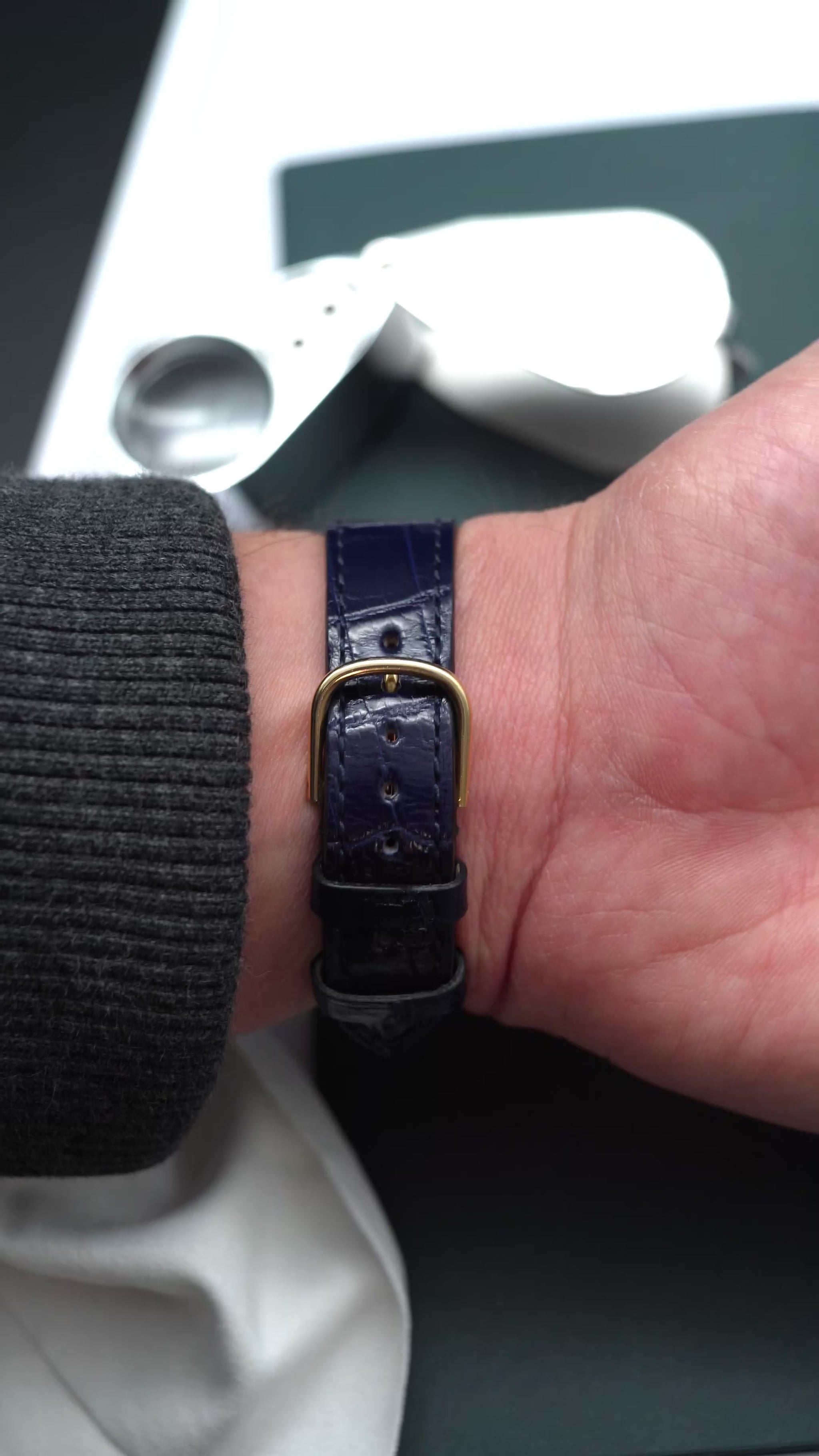 The uniquely shaped elliptical case in 18K yellow gold measures approximately 31 × 32 mm, offering a balanced yet distinctive wrist presence. The deep blue dial with simple line indices enhances its understated charm, while the sapphire crystal protects the dial with clarity and durability.