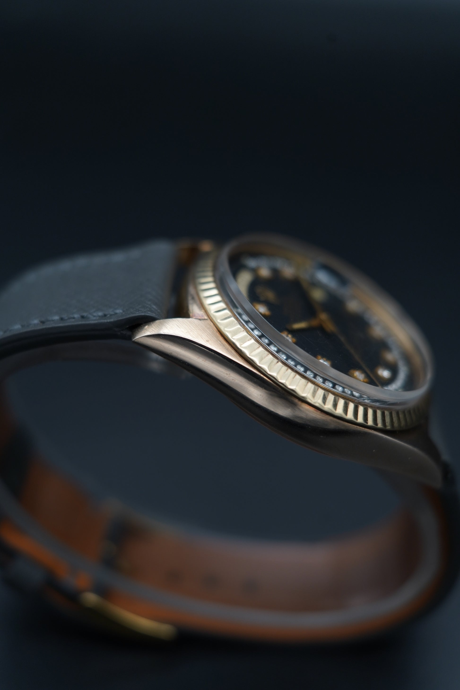 The Rolex Day-Date reference 1803 is one of the Maison’s most iconic watches, a symbol of prestige and refinement. Crafted in 18kt gold, with a 36mm case and smooth bezel, it features an original matte black dial, enhanced with a set of diamonds added later. The watch houses an automatic mechanical movement, with the classic functions of hours, minutes, seconds, date, and day at 12 o’clock—features that have made the Day-Date line famous.
