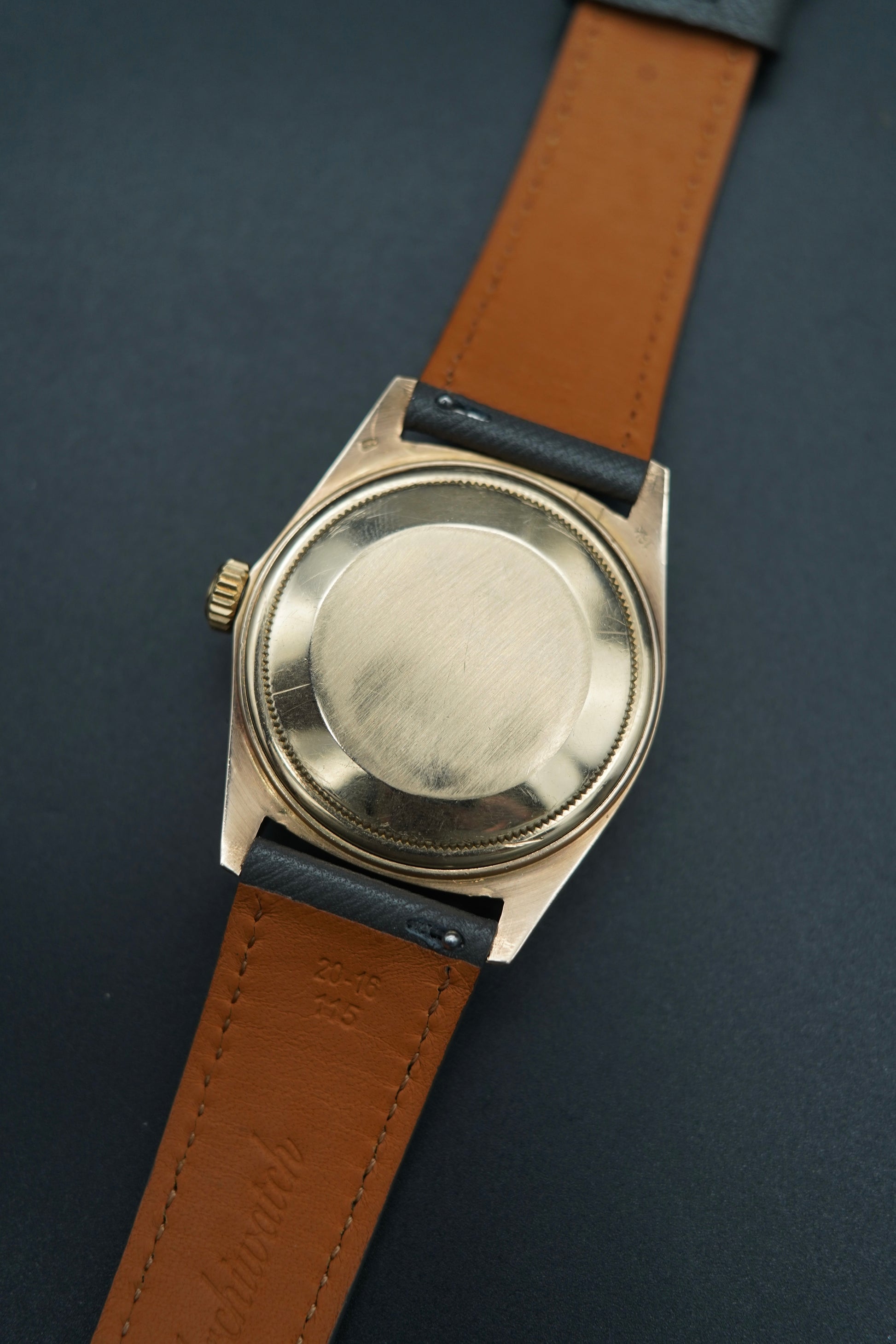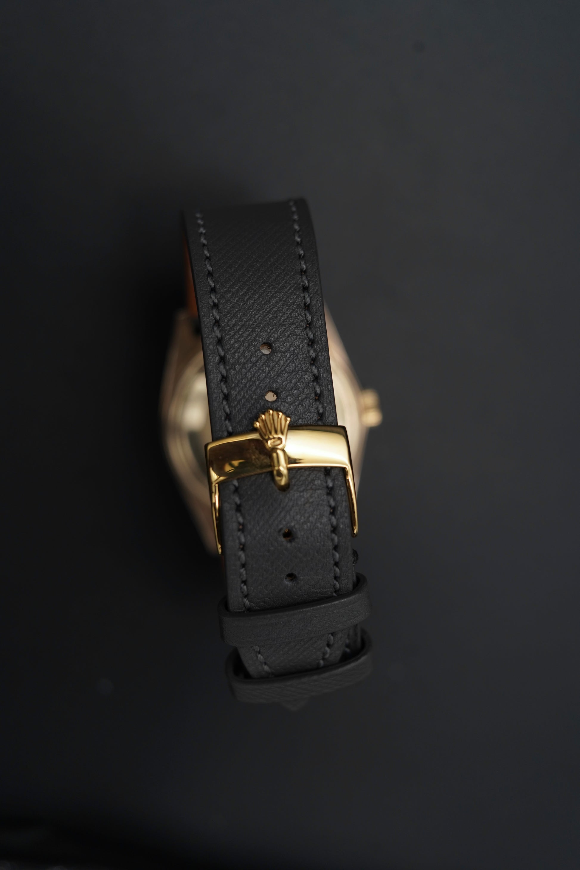 Protected by a plexiglass crystal and an 18kt gold case back, the watch retains all the timeless elegance of vintage Rolex models. It comes with a generic anthracite leather strap with an original gold-plated pin buckle. A timepiece that combines the strength of tradition with the exclusive elegance of fine details.