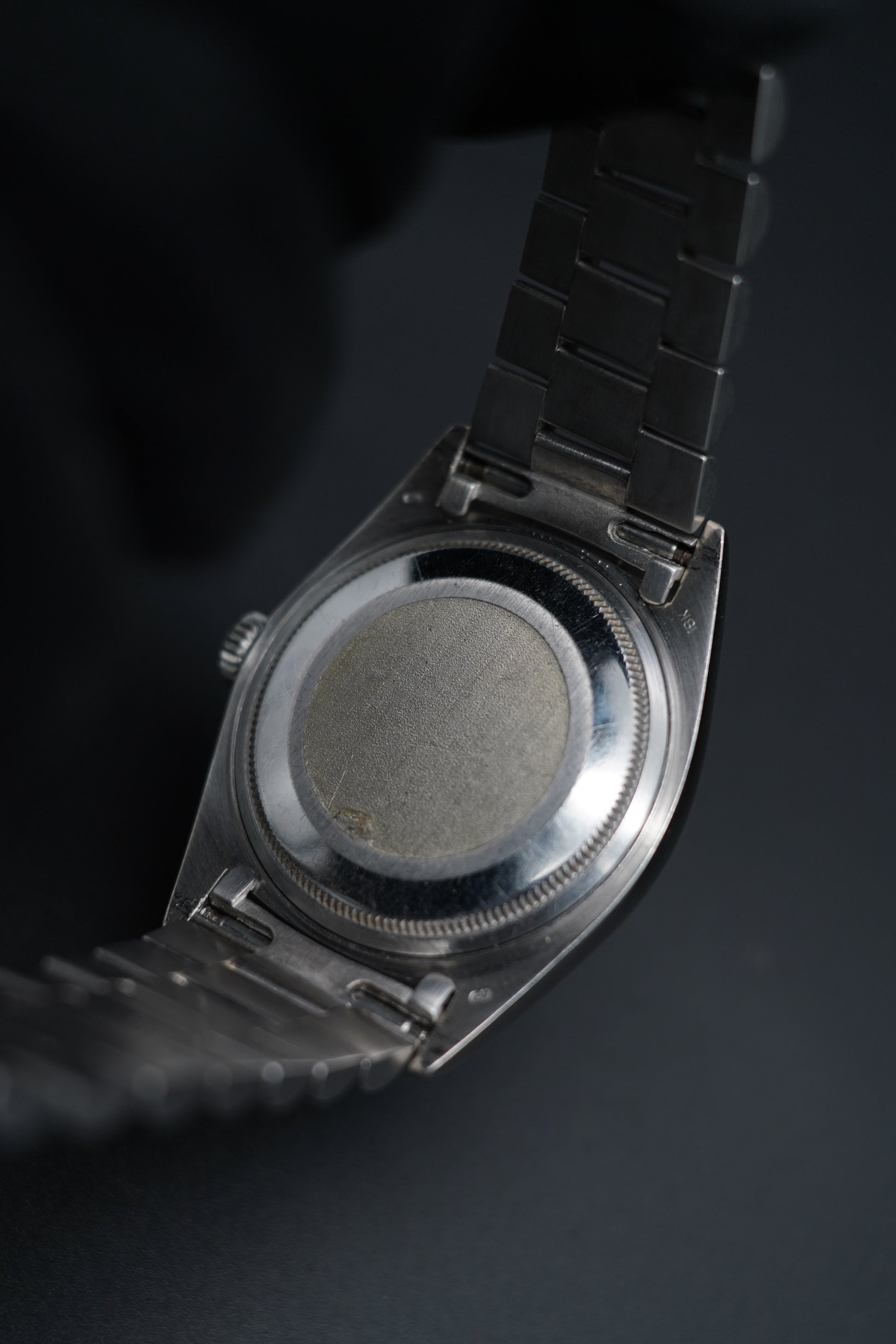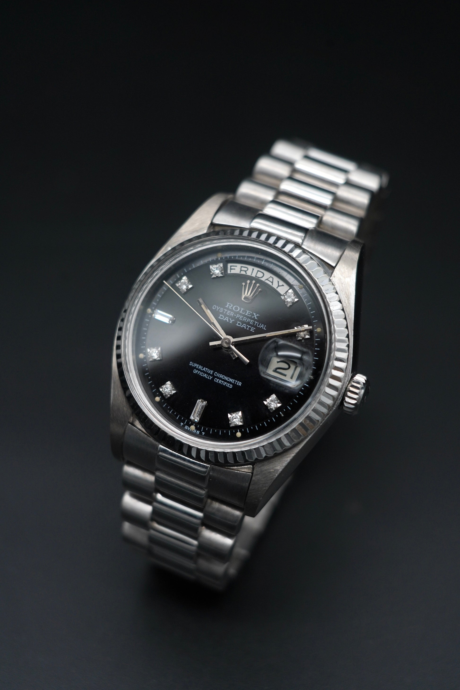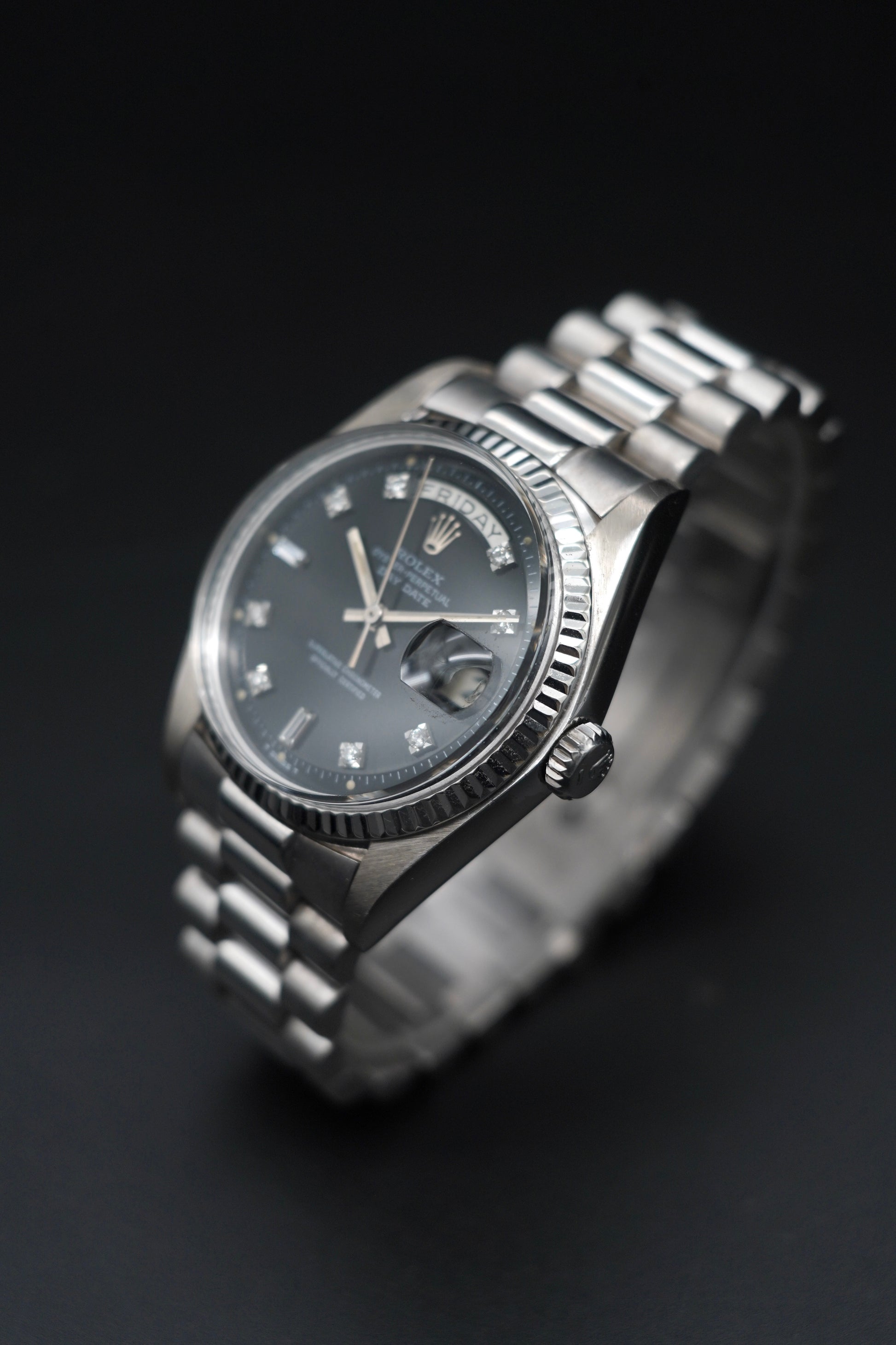 The Rolex Day-Date reference 1803, also known as the President, is an icon of prestige and refinement. This version, crafted entirely in 18kt white gold, stands out for its understated and timeless elegance. The 36 mm case, with matching bezel and a white gold case back, houses a black dial with diamond hour markers, a detail that enhances its precious character.