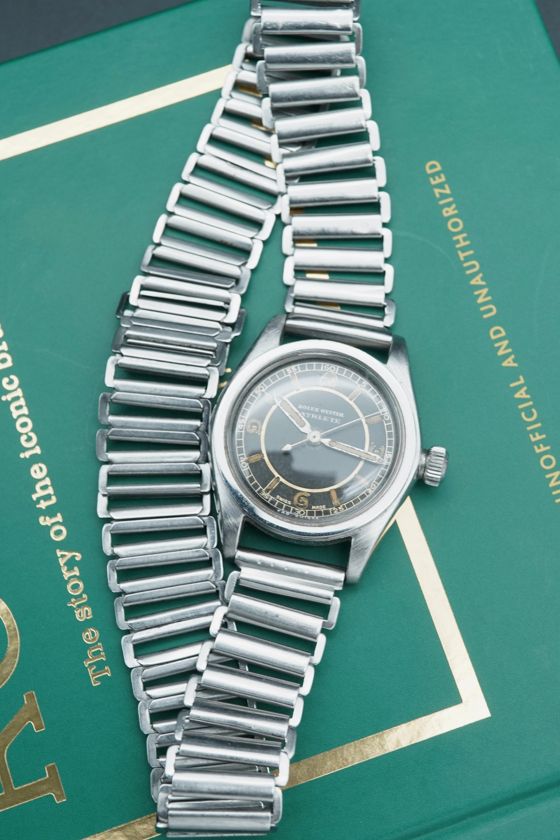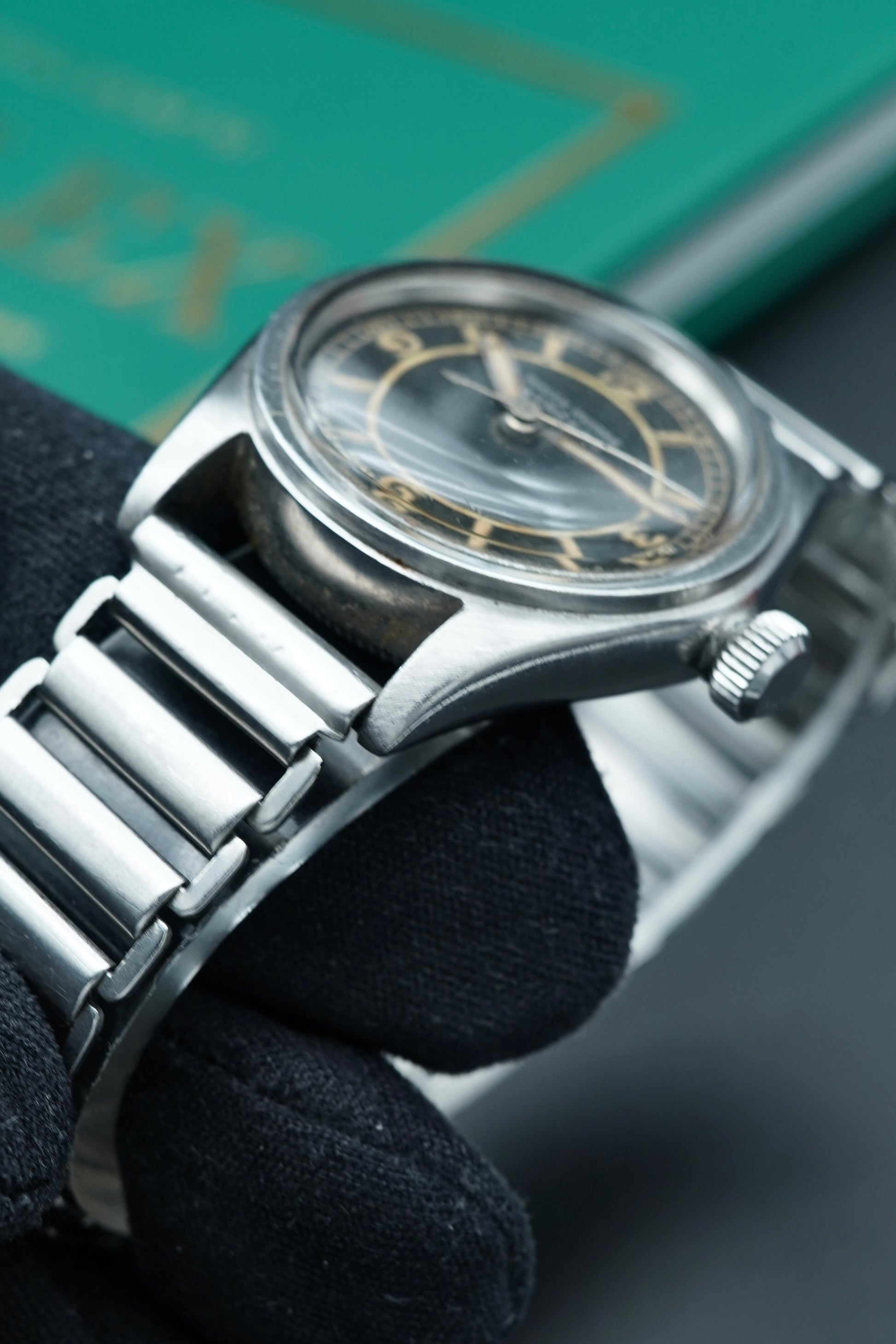 Powered by a manual-winding movement with 17 jewels, this Athlete delivers straightforward timekeeping rooted in mechanical tradition. The stainless steel bracelet and matching steel bezel complete the ensemble, preserving the utilitarian charm and robustness typical of early Oyster models.