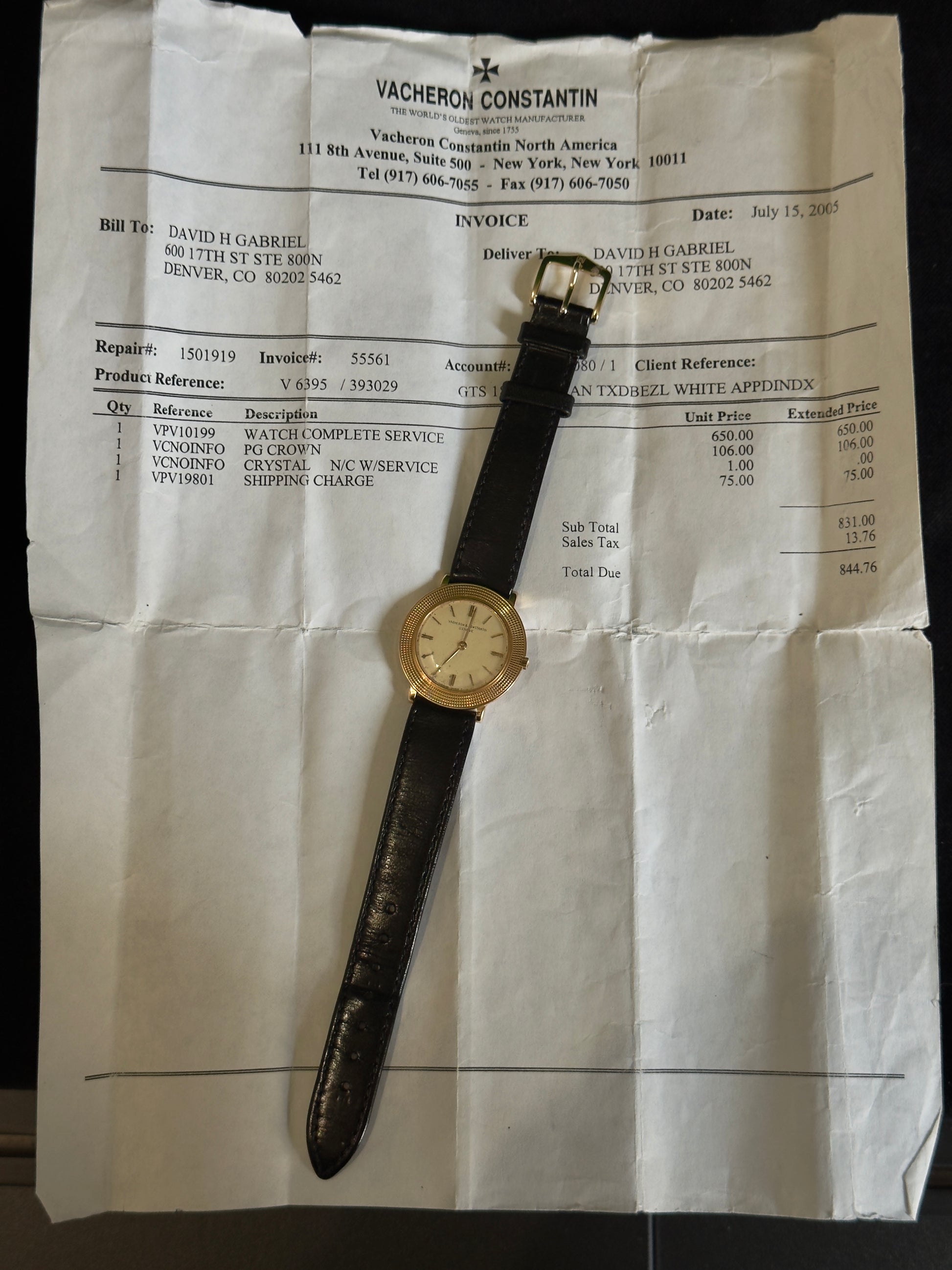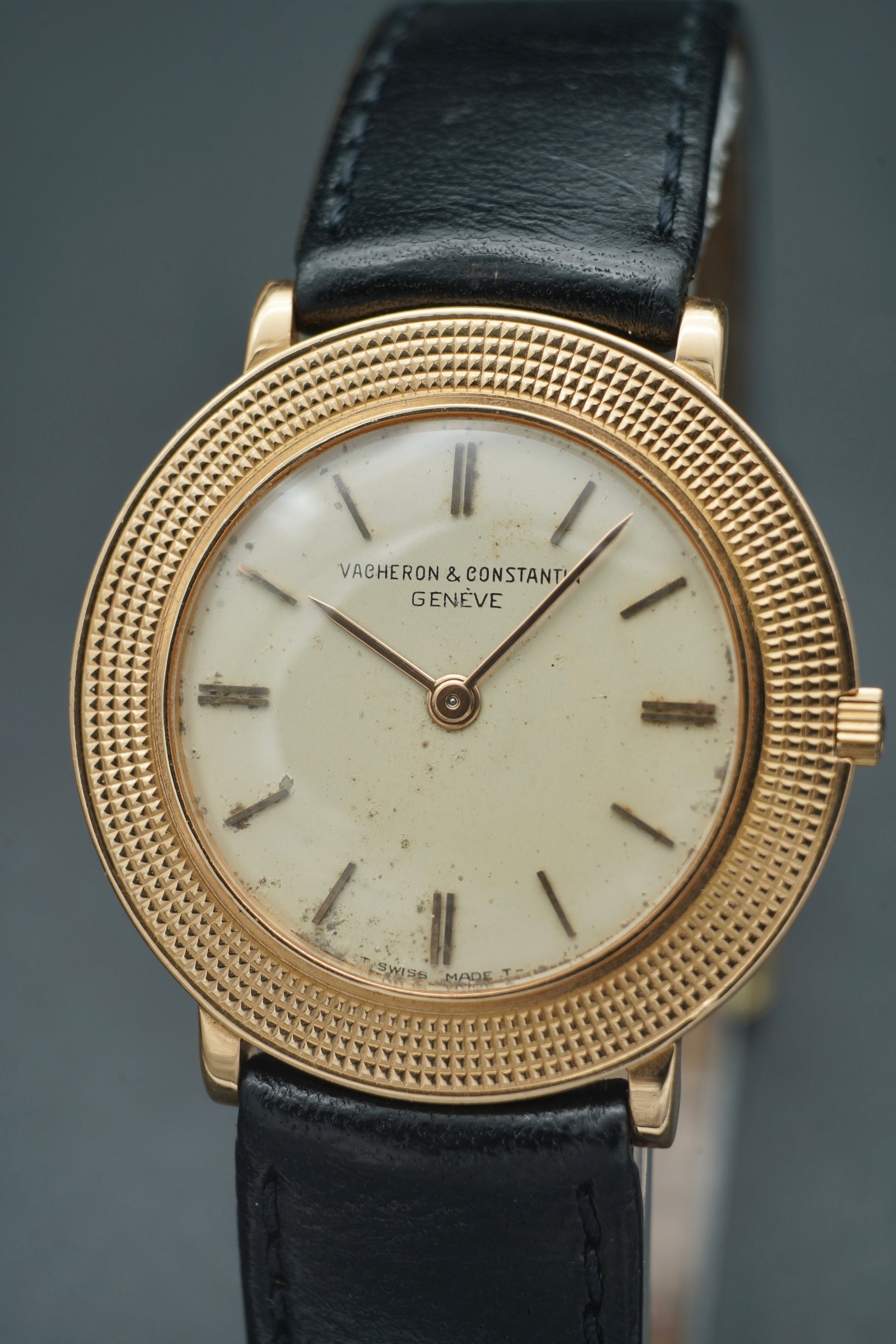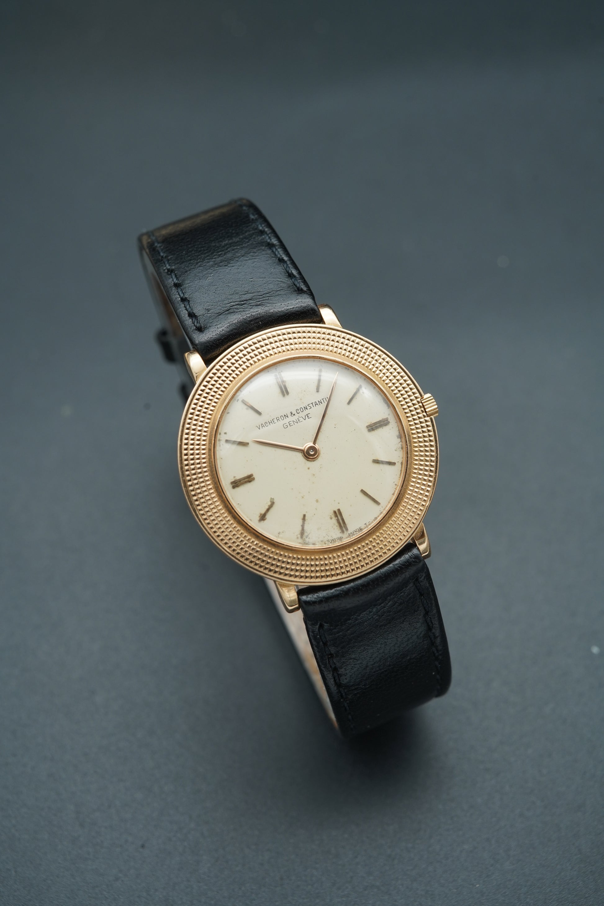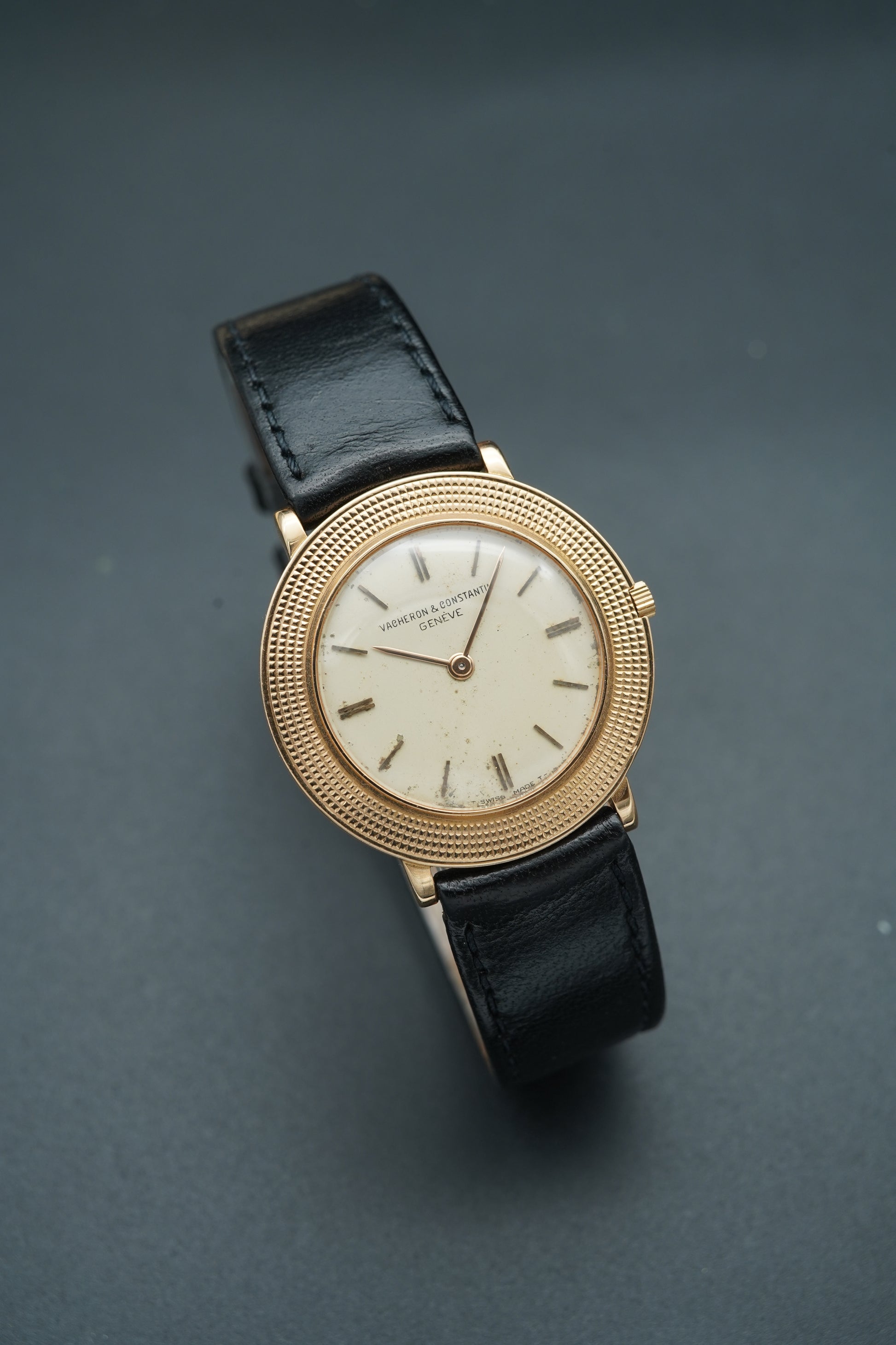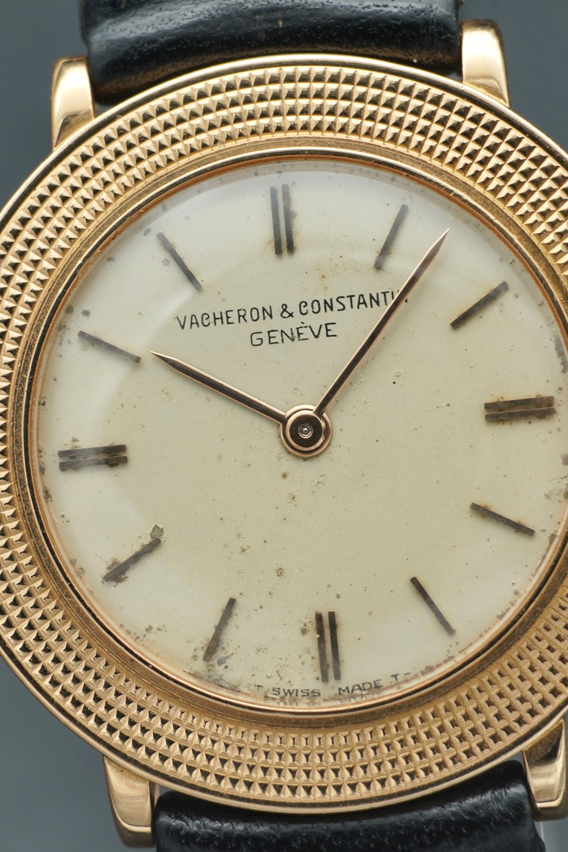 The 30.5 mm rose gold case features a slim, harmonious profile, with both bezel and screw-down caseback in rose gold — an uncommon detail for dress watches of that era. The white dial, marked by small natural age-related imperfections, retains a sober and refined aesthetic, true to Vacheron Constantin’s minimalist style.